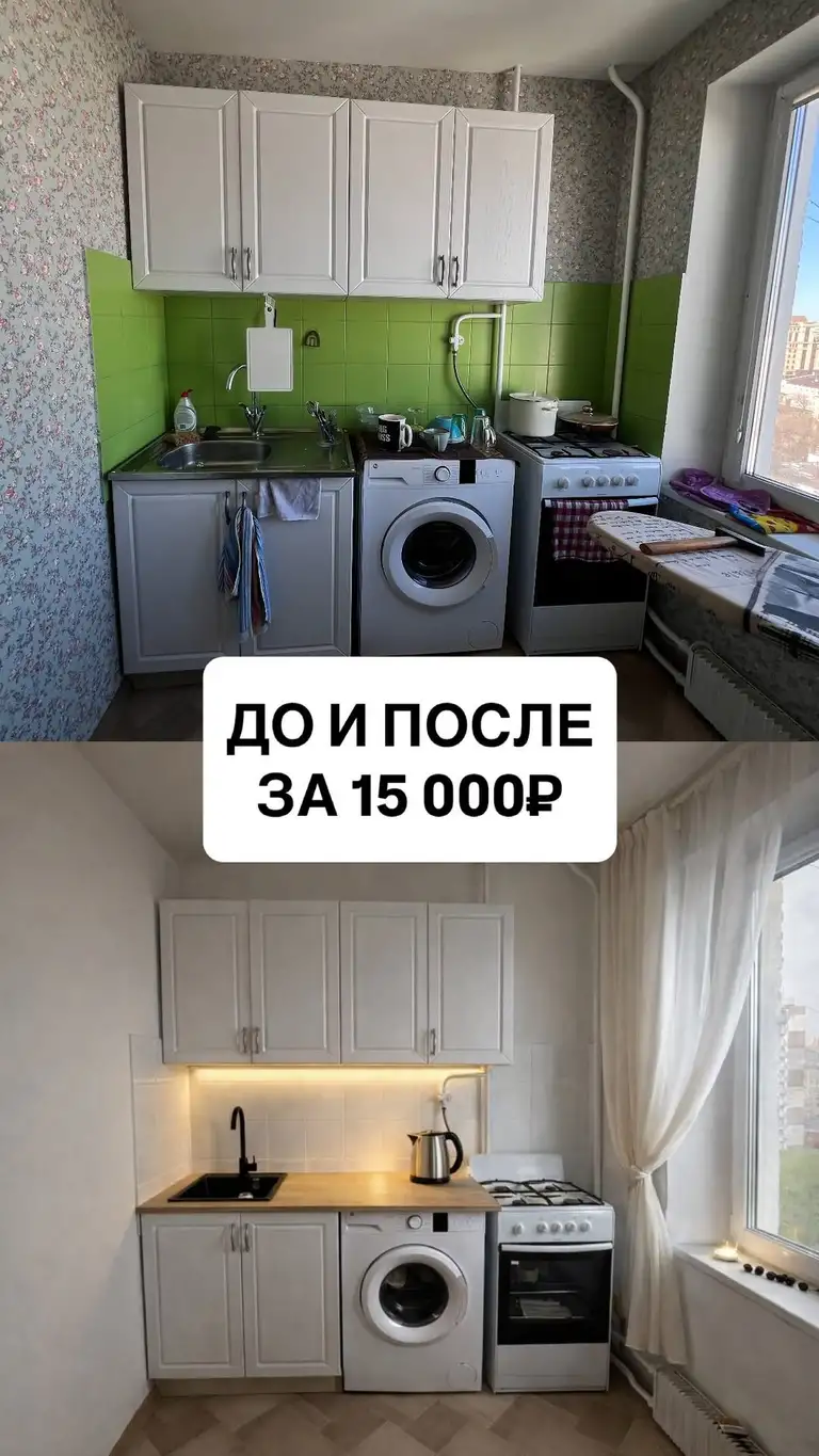 arinchoz Продолжаю серию про ремонт в съемной квартире Вани. Раньше на кухне вместо стола была гладильная доска и пара табуреток. Не было места, чтобы элементарно нарезать салат и заварить себе кофеек, к слову - чайник стоял на полу. На кофеек подружку уже не пригласить)) с таким бытом можно навсегда было остаться одиноким волчарой 🐺 Первым делом мы передвинули холодильник в коридор! Чтобы тупо открыть окно. До холодильника из кухни в коридор два шага, а не 700 километров, за это не переживайте))) Давайте теперь по смете, во сколько все обошлось: Стол - 4 154₽ Стулья 2 шт - 3 492₽ Столешница - 2 817₽ Мойка - 3 526₽ Смеситель - 765₽ Ручки для шкафчиков - 436₽ Итого: 15 190₽ Покрасили обои и зеленый фартук из плитки, Ваня обещал, что покрасит вторым слоем, по моим ощущениям там нет второго слоя… Мойку и стиралку объединили одной столешницей и так получили рабочее пространство и над столешкой установили беспроводную подсветку. Заказали нормальные стулья вместо табуреток и круглый стол - такая форма самая оптимальная для мини кухонь. Беспонтовые ручки мы поменяли на черные. Газовой плитой Ваня ни разу не пользовался, он его использует как ящик для хранения, прям как Керри Брэдшоу, только она в духовке хранила туфли😄 И чайник сейчас стоит не на полу, это радует! Если есть еще вопросы, пишите 👇🏻 #кухня #кухнямоеймечты #ремонт #бюджетныйремонт #ремонтквартиры #ремонтквартирмосква #ремонтквартир #флиппинг #флиппингнедвижимости #флиппингмосква #дизаинкухни #ремонткухни