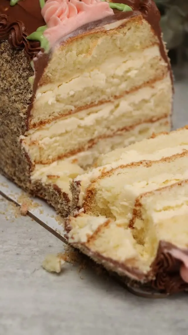 craftology.ru Торт “Сказка” 🌿 Вкус, знакомый с детства! Бисквит: Яйца - 200 г (4 шт С1) Сахар - 100 г Мука - 100 г Соль - 1 г Ванилин - 1 г Яйца разделить на белки и желтки. Желтки взбить с частью сахара (30 г) до побеления и увеличения в объеме. Белки взбить с оставшимся сахаром (70 г) до мягких пик. Половину белков слегка перемешать с желтками, всыпать сухие ингредиенты, немного объединить, ввести оставшиеся белки и быстро замесить тесто, не допуская осаждения. Перелить в форму 20 см и выпекать при 160°С 30 минут. Охладить и убрать в холодильник для стабилизации на 4 часа. Крем: Молоко - 120 г Желток - 30 г Сахар - 170 г Ванилин - 1 г Сливочное масло 82% - 200 г Коньяк - 10 г Молоко, желтки, сахар с ванилином при постоянном помешивании довести до первых пузырьков. Накрыть пищеовй пленкой и оставить при комнатной температуре до полного охлаждения. Пластичное сливочное масло взбить до побеления и увеличения в объеме. Добавить охлажденную заварную основу в два этапа, каждый раз взбивая до однородности. По желанию добавить коньяк. 180 г крема отложить для декора. Пропитка: Сахар - 125 г Вода - 125 г Коньяк - 20 г Сахар с водой довести до кипения. Охладить. Добавить коньяк. Сборка: Бисквит разрезать вдоль, потом пополам, сложить в стопочку и закруглить края. Собрать торт, чередуя коржи, пропитку и крем. Все загрунтовать и убрать торт в холодильник на 12 часов. В 120 грамм крема добавить 20 грамм алкализованного какао. Равномерно покрыть торт. Края обсыпать бисквитной крошкой и сделать узор с помощью насадки №21. Оставшиеся 60 г крема окрасить водорастворимыми красителями. Нарисовать веточку из крема и отсадить цветочки с помощью насадки Е12.