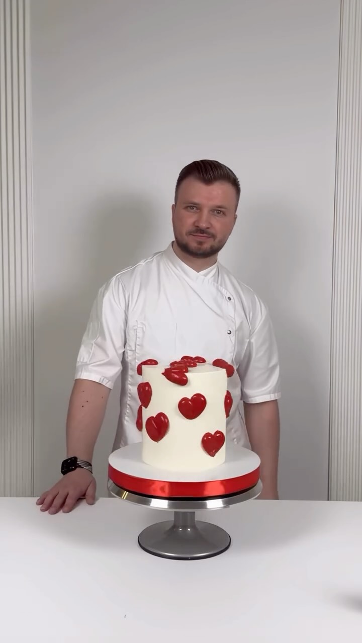 cupcakehouse_moscow Простой декор торта на 14 февраля♥️ На видео я показал базовый пример такого декора, но его можно разнообразить: ▪️сделать сердечки разных цветов: красные, розовые, сиреневые ▪️можно расположить сердечки не в шахматном порядке, а более хаотично ▪️Сердечки можно сделать разного размера, маленькие, средние и большие ▪️ Можно не закрашивать часть сердечек, а оставить их под цвет торта. Например, закрасить только одно сердечко по центру