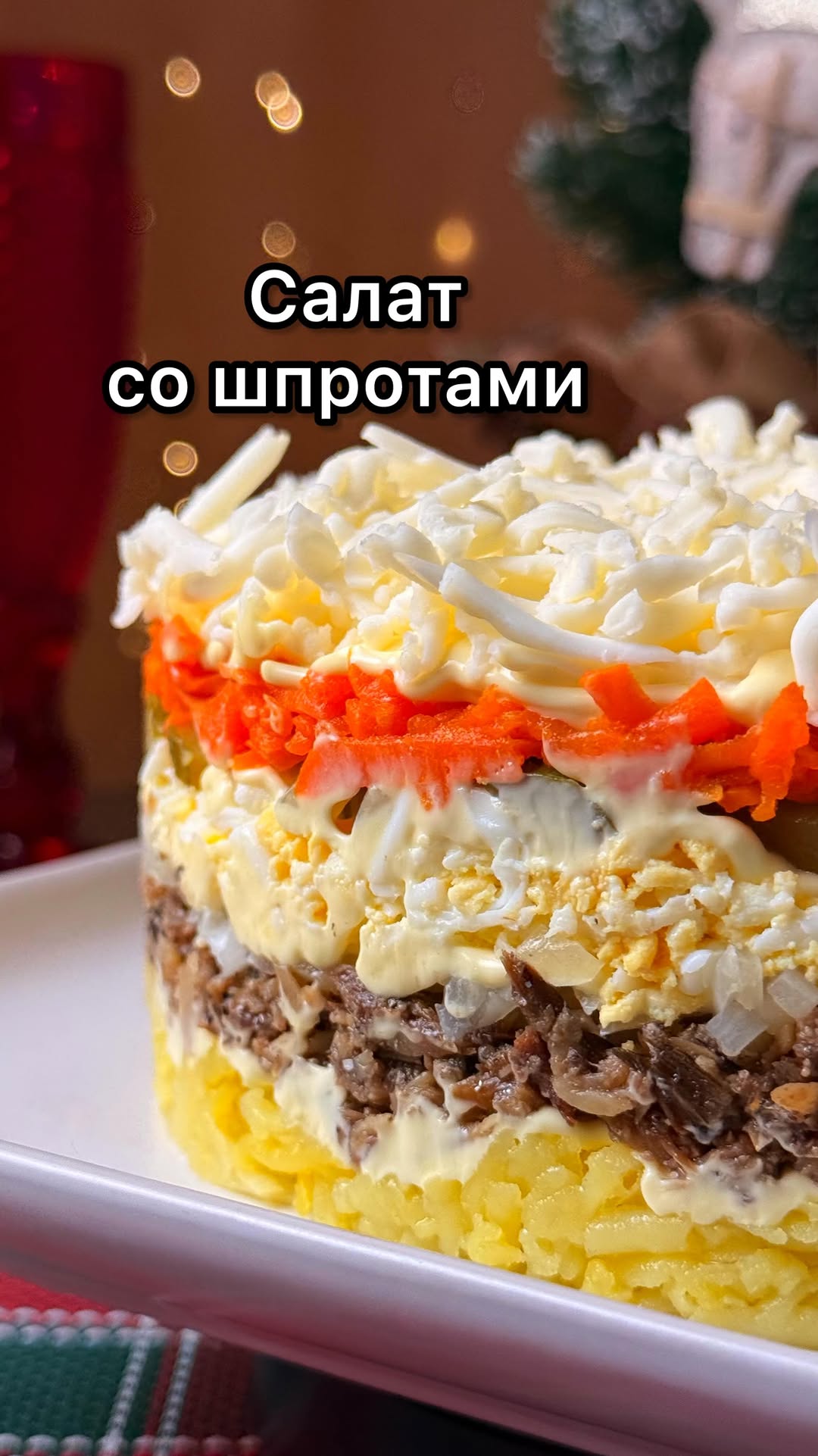 dasg_96 Слоеный салат со шпротами 🎄 *Диаметр моей круглой формы — 16 см 📝 Ингредиенты: ✔️Шпроты — 1 банка (240 г) ✔️Картофель — 200 г ✔️Морковь — 100 г ✔️Репчатый лук — 70 г ✔️Яйцо — 3 шт ✔️Маринованные огурцы — 100 г ✔️Плавленый сырок «Дружба» — 1 шт (90г) ✔️Майонез ✔️Сок лимона 📝 Приготовление: 1️⃣ Картофель и морковь запечь в духовке до готовности (обернуть в фольгу, запекать около 40 мин на 200°). Остудить, очистить и натереть на крупной тёрке. 2️⃣ Со шпрот слить масло и размять рыбу вилкой. 3️⃣ Репчатый лук нарезать мелким кубиком, обдать кипятком и сбрызнуть лимонным соком. 4️⃣ Яйца отварить вкрутую и натереть на крупной терке. 5️⃣ Огурцы нарезать мелким кубиком. 6️⃣ Плавленный сырок натереть на крупной терке. Слои салата: 1. Картофель (слегка присолить) 2. Сеточка майонеза 3. Шпроты 4. Репчатый лук 5. Сеточка майонеза 6. Яйца 7. Сеточка майонеза 8. Маринованные огурцы 9. Морковь 10. Сеточка майонеза 11. Плавленый сырок Готовому салату дать настояться пару часов в холодильнике. Готовьте с удовольствием! 🎄❤️ #салатсошпротами #салатнапраздничныйстол #праздничныйсалат #шпроты #салатнановыйгод