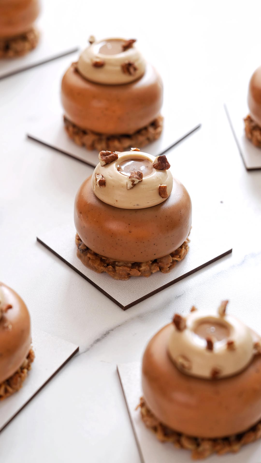 ex_pastry_cook ✅РЕЦЕПТ Пирожные: Банан- Пекан из моей 2 книги : Путеводитель Кондитера 📕 Обе мои книги можно найти на маркетплейсах, а также в читай городе , благодарна невероятно за все отзывы 🥰 на 8 шт в форме stone и объем 80 мл 1 шт После выхода моей первой книги целый месяц каждый день я получала отзыв именно на него - на Банановый кекс. Не представляете как я была удивлена и приятно, ведь я сама безумный фанат банановых десертов. Поэтому не задумывалась ни на миг, точно знала, что и тут будет подобный десерт, но еще более фееричный! Готовьте обязательно, это настоящее наслаждение для сладкоежки! ✔️банановый бисквит: 80 грамм размятого спелого банана 1 яйцо С 1 55 грамм 60 грамм тростникового сахара 50 грамм цельнозерновой пшеничной муки 30 грамм молотого пекана средней фракции 30 грамм растительного масла 4 грамма разрыхлителя пряные специи по желанию ( корица, имбирь, мускатный орех) щепотка соли Мой любимый вид бисквитов для порционных десертов. Не взбиваем, не мучаемся с порядком. Просто за раз объединяем все ингредиенты в миске венчиком и выливаем на тефлоновый коврик слоем в 5 мм. Выпекаем при температуре 165 градусов 10-15 минут до румяности. Накрываем еще горячий пленкой, охлаждаем и после вырубкой 4,5 см вырезаем перед сборкой. ✔️Банановый ганаш на молочном шоколаде: 90 грамм молочного шоколада 45 грамм пюре банана 90 грамм сливок 33% 2,5 грамма желатина 220 блум ( замочить 10 граммах воды) сливки нагреваем, разводим в них желатин, который предварительно замочили. Выливаем на шоколад с пюре банана. Пробиваем блендером и разливаем через кондитерский мешок в форму мини stone 4 см диаметр или в полусферу 4 см Замораживаем от 6 часов. Продолжение будет в комментариях 🥰
