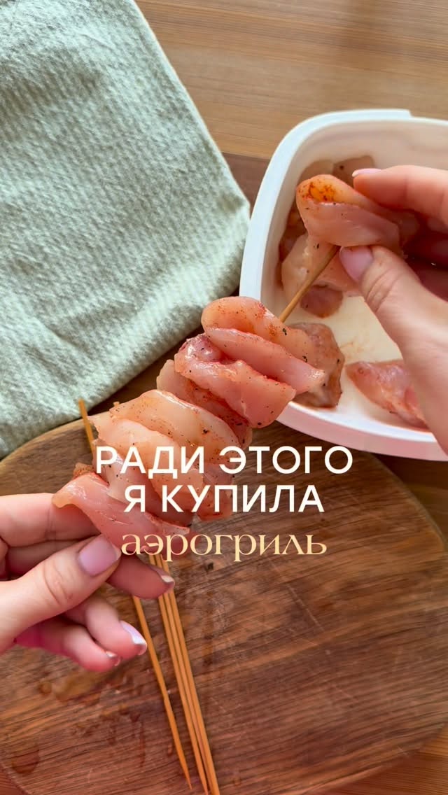 larinolya 2/3 рецептов для аэрогриля 😍 Куриная грудка Специи Зелень Чеснок Сыр пармезан Масло оливковое Соль, перец Шпажки 1. Шпажки замочить заранее в воде 2. Курочку нарезать на кусочки, замариновать в специях, соли, перце, нанизать на шпажки. 3. Отправить в аэрогриль на минут 10. 4. Дальше достать и смазать смесью масла, сыра, зелени и чеснока. И ещё на минуты 3-4, чтобы все подрумянилось. Красиво, вкусно!