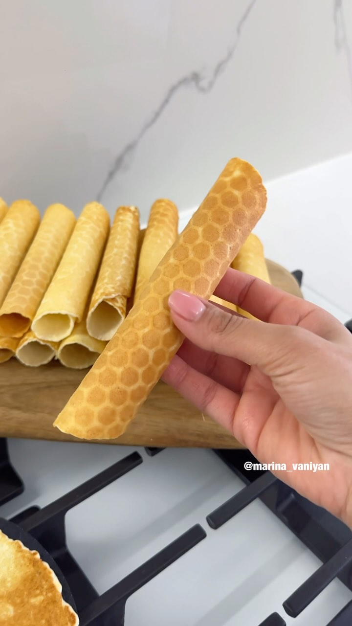 marina_vaniyan Вафельные трубочки, как из детства 🥰 ИНГРЕДИЕНТЫ: яйцо 2 шт сахар 80 г сливочное масло 100 г молоко 150 мл мука 180 г разрыхлитель 1 ч/л ванилин 1 г Для крема: Сливочное масло 1 пачка Вареное сгущеное молоко 1 банка ПРИГОТОВЛЕНИЕ: Яйца взбиваем с сахаром, добавляем молоко, сливочное масло, ванилин. Далее просеиваем муку и разрыхлитель. Все взбиваем, тесто готово ✅ Тесто выкладываем в вафельницу и выпекаем. Сразу в горячем виде сворачиваем в трубочку. Приятного аппетита 😋 #трубочкисосгущенкой #вафельныетрубочки #вафельныекрошки #трубочкискремом