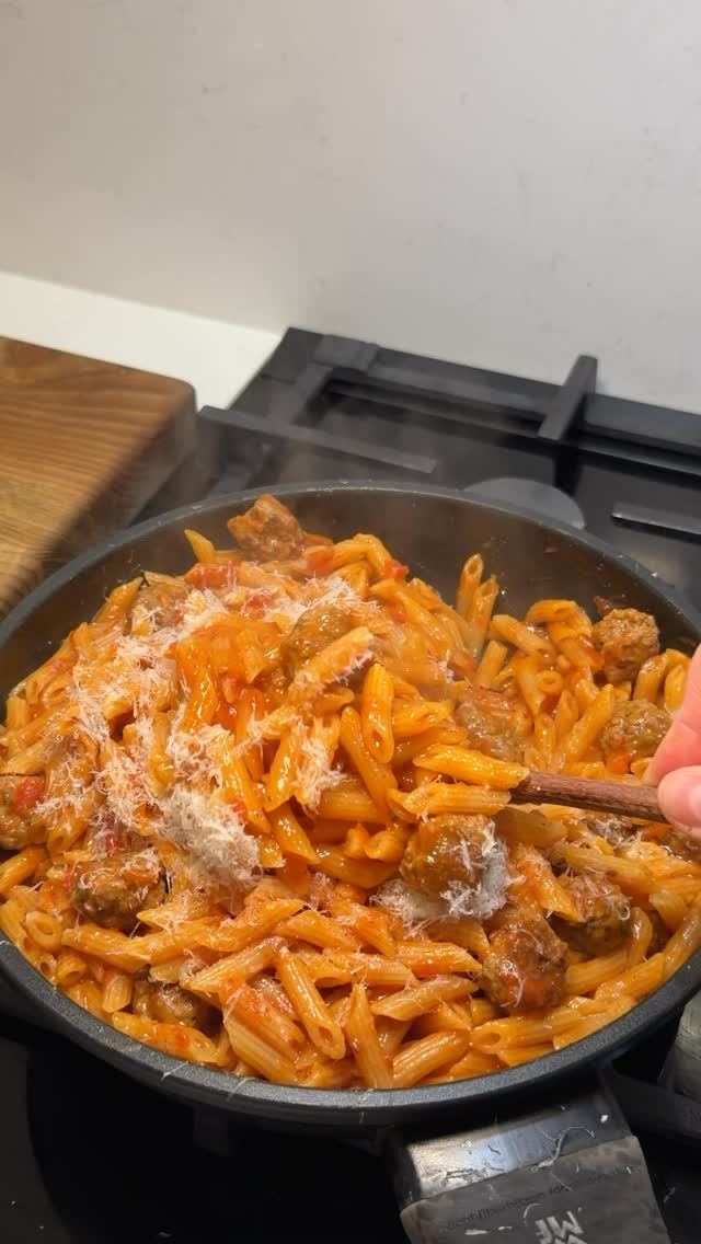 masha.stories На обед – паста 🍝 Обожаю такой способ, когда паста варится сразу в соусе. Получается быстро, с минимум посуды и очень сочно Фарш из говядины или уже готовые фрикадельки Паста, у меня мини пенне Томатный соус Вода Соль Все просто, главное переодически помешивать пасту и выбирать такие сорта, которые варятся не более 5-6 минут, вот