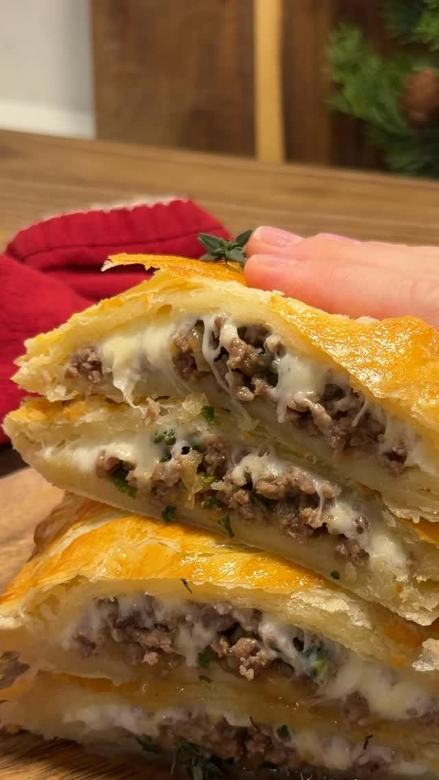 masha.stories Очень вкусные пирожки, на праздники или на новогодний стол – тоооп! Слоеное без дрожжевое тесто - 1 упаковка, 2 пласта Говяжий фарш - 300 гр Репчатый лук - 1 шт Зеленый лук - 1 шт Соевый соус - 3 ст ложки Чеснок - 2 зубчика Сыр Желток - 2 шт Тимьян 1.Готовится все очень просто, в одном сотейнике. Нарезаем лук, обжариваем, добавляем фарш, обжариваем вместе до готовности. Натираем туда чеснок, вливаем соевый соус, все перемешиваем 2.Тесто размораживаем и разделяем на 2 части. Выкладываем начинку, сверху выкладываем сыр. Чуть растягиваем тесто, защипываем края каждого пирожка и дублируем вилочкой. Делаем надрезы ножом. Смазываем желтком. 3.Выпекаем пирожки в разогретой до 185’ духовке на среднем уровне 20-25 минут, на режиме верх -низ Украшаем свежим тимьяном и подаем, вот