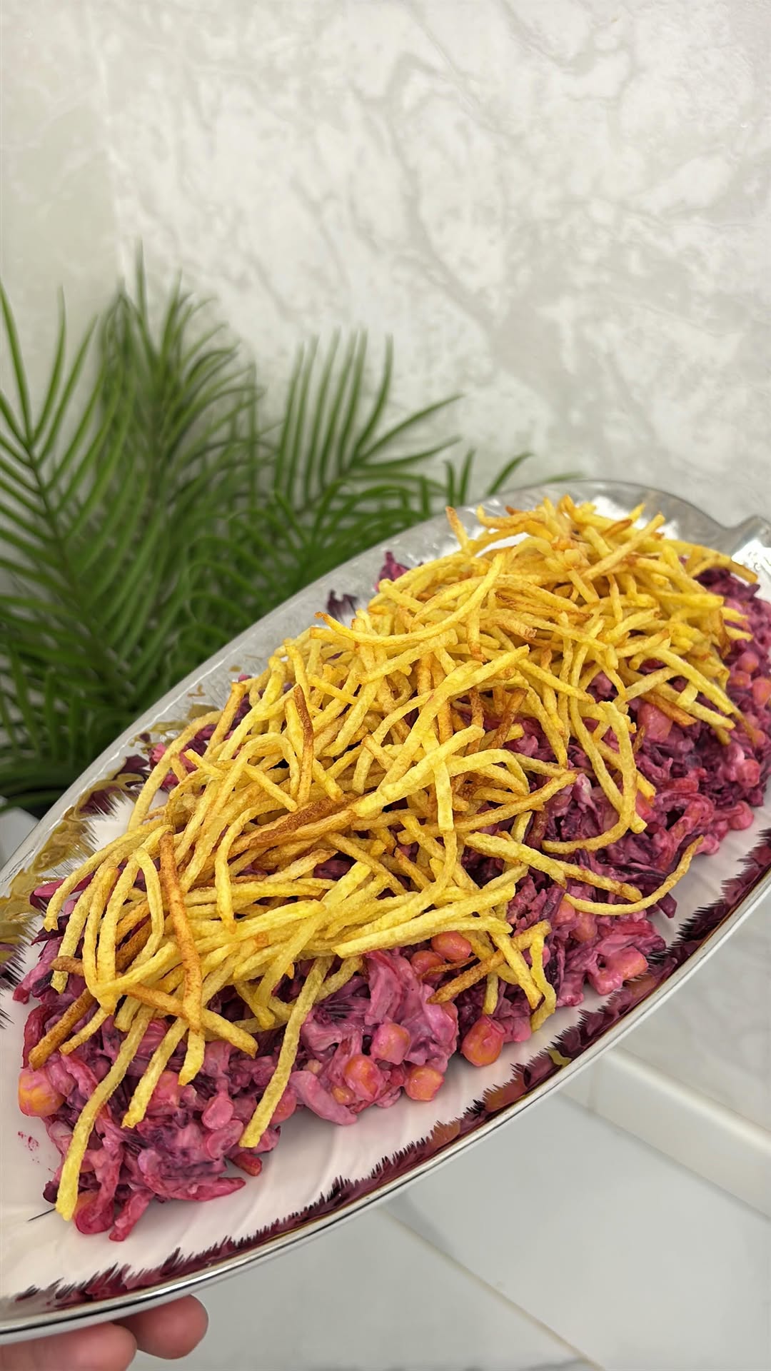 musoeva.r Безумно вкусный салат из простых ингредиентов ❤️ Ингредиенты: Свекла отварная 4 шт Яйца 4 шт Картошка 3-4 шт Кукуруза 🌽 Майонез по вкусу Способ приготовления сначала варим яйца и свеклу до готовности. Картофель натрём через тёрку и жарить до золотистой корочки. Далее как на видео, обязательно попробуйте это очень вкусно 👍