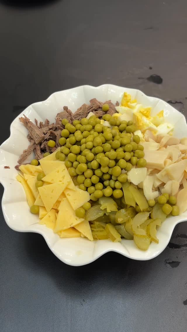 musoeva.r Безумно вкусный салат 🥗 Ингредиенты: Мясо 500 гр , можно брать куриную грудку 🤙🏻 Консервированный грибы 1 банка Яйца 3 -4 шт Сыр 200 гр Зелёный горошек Майонез И маринованные или солёные огурцы 2-3 шт Обязательно попробуйте это очень вкусный салат 🥗