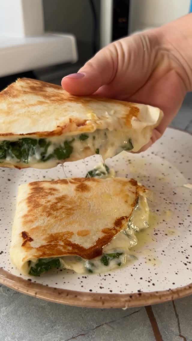 pe4urkina Сырная белковая лепешка на завтрак 🍳 Это очень вкусно ! 🤤 Ингредиенты: -1 лист тортильи -2 белка -сыр (у меня сулугуни) -шпинат или петрушка Готовиться быстро , получается оч вкусно 🤤