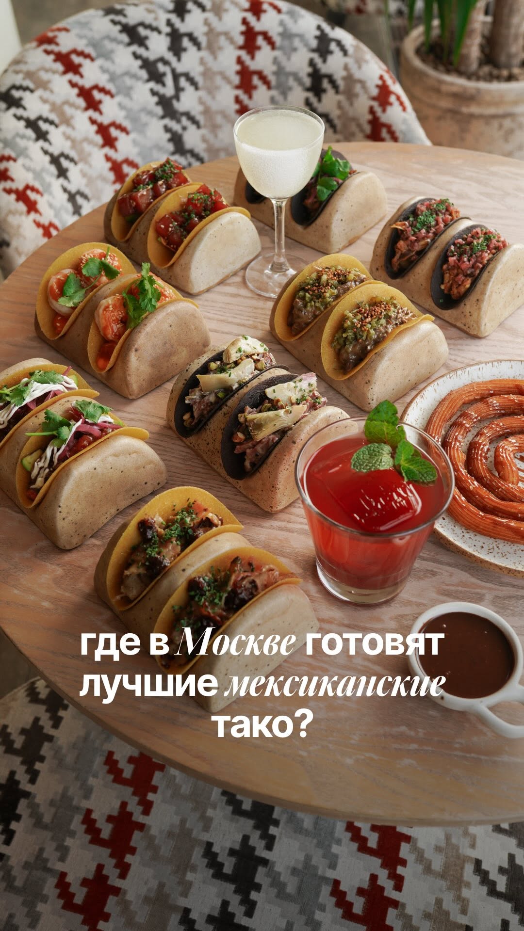 restinmsk Где в Москве готовят лучшие мексиканские тако? Если мы хотим не стритфуд, а ресторанную Мексику, то приезжаем в @tacobar.moscow. Начинаем с самого популярного: тако с тунцом, авокадо и соусом чипотли. Еще один фаворит — с пастрами, артишоками и халапеньо, на солодовой лепешке. — а ещё тако со свиным ребром и сальсой из редиса и яблока. Всего в меню — 8 классных вкусов. Два тако в порции. 750 р. К закускам — коктейли на свежевыжатых соках. Абсолютно все миксы здесь готовят на фрешах. Наши фавориты: Мескаль Маргарита с апельсиновым ликером, Orange Passion на джине и роме и гранатовый Негрони. Все по 960₽. На десерт — чуррос с шоколадом 650₽ и какао с солью и перцем 680₽. Пятницкая, 59/19с5