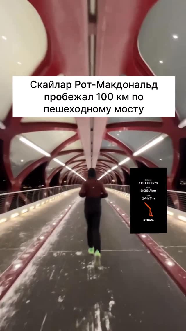 russiarunning 💡Если бы вы спросили у Скайлара Рота-Макдональда, чем занять остаток выходных, он предложил бы побегать с ним по мосту. Километров сто! Рот-Макдональд знает каждый метр моста Мира через реку Боу в Калгари. Там он намотал 100 км, бегая туда и обратно. Длина моста — 130 метров 🫨 Он вышел на старт в 7:30 утра, когда на улице был мороз −20°C. На мостоультру потребовалось 14 часов и 7 минут 🤯 Рот-Макдональд регулярно бегает длинные дистанции и в 2025 году намотал 100 км вокруг телебашни в Торонто. Он говорит, что стремится вдохновлять людей выйти на пробежку, даже если это 1 км. Как Форреста Гампа, на дистанции его всегда поддерживают случайные люди. Внимание, вопрос! Сколько раз Рот-Макдональд в итоге сбегал туда и обратно? Видео: skylarruns