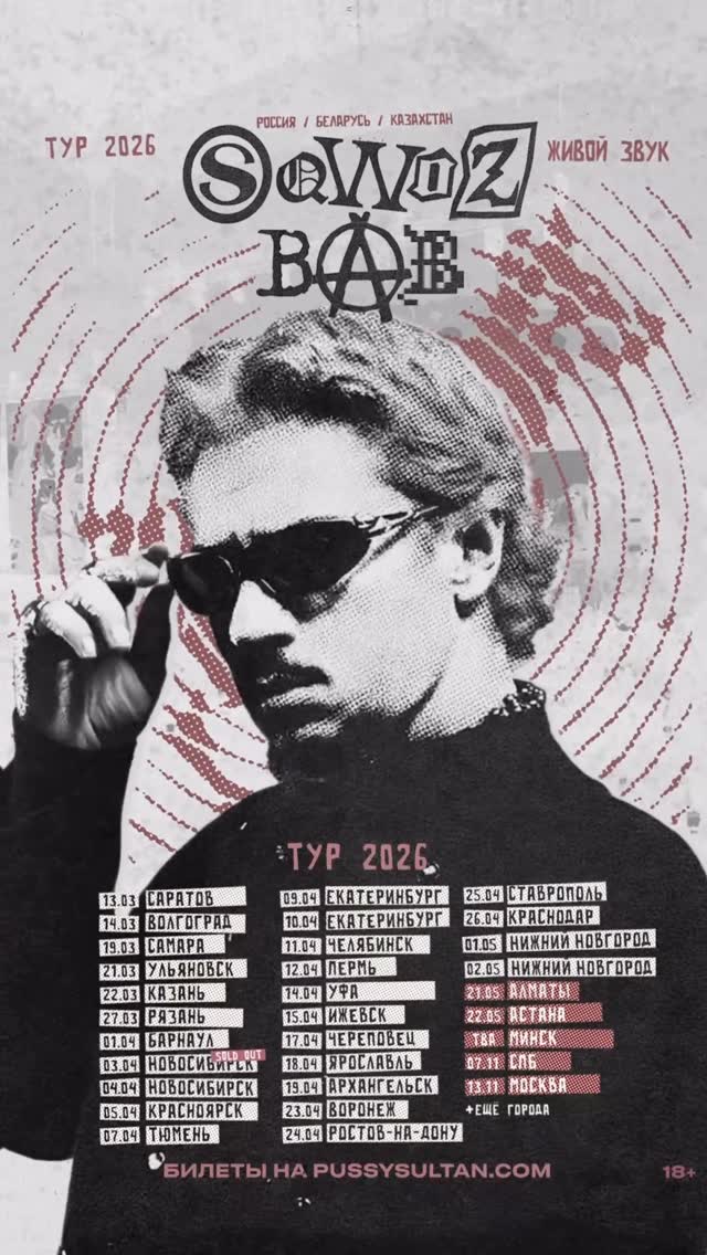 sqwozbabs SQWOZ BAB • TOUR 2026 • LIVE BAND UPD: билеты жоско заканчиваются! • Добавили дни в Новосибирске, ЕКБ и Н.Новгороде • Барнаул, Астана, Алматы - поменяли площадки на побольше (все ранее купленные билеты действительны!) Запрягаем телегу с live-бэндом и отправляемся с новой программой в тур 2026 с презентацией альбома и исполнением ваших любимых шлягеров! БИЛЕТЫ: PUSSYSULTAN.COM 13.03 — Саратов • Onyx 14.03 — Волгоград • Kultura Concert Hall 19.03 — Самара • Метелица-C 21.03 — Ульяновск • Пятое Солнце 22.03 — Казань • Корстон 27.03 — Рязань • Deep club 01.04 — Барнаул • Фараон 03.04 — Новосибирск • Подземка 04.04 — Новосибирск • Подземка 05.04 — Красноярск • Circus concert hall 07.04 — Тюмень • Глав Клуб 09.04 — ЕКБ • Свобода Концерт Холл 10.04 — ЕКБ • Свобода Концерт Холл 11.04 — Челябинск • Галактика 12.04 — Пермь • Свобода Концерт Холл 14.04 — Уфа • Тинькофф Холл 15.04 — Ижевск • Nobel 17.04 — Череповец • Zavod 18.04 — Ярославль • Руки вверх! 19.04 — Архангельск • М33 23.04 — Воронеж • Palazzo 24.04 — Ростов-на-Дону • КСК Экспресс 25.04 — Ставрополь • Abrikos Arena 26.04 — Краснодар • Порт 219 01.05 — Н.Новгород • Milo Concert hall 02.05 — Н.Новгород • Milo Concert hall 21.05 — Алматы • Colossus 22.05 — Астана • Garden Hall TBA — Минск • Falcon club 07.11 — СПБ • Ледовый дворец 13.11 — Москва • ВТБ Арена *список городов будет пополняться* БИЛЕТЫ: PUSSYSULTAN.COM КОНЦЕРТНЫЙ ЧАТИК: sqwozbab_afisha