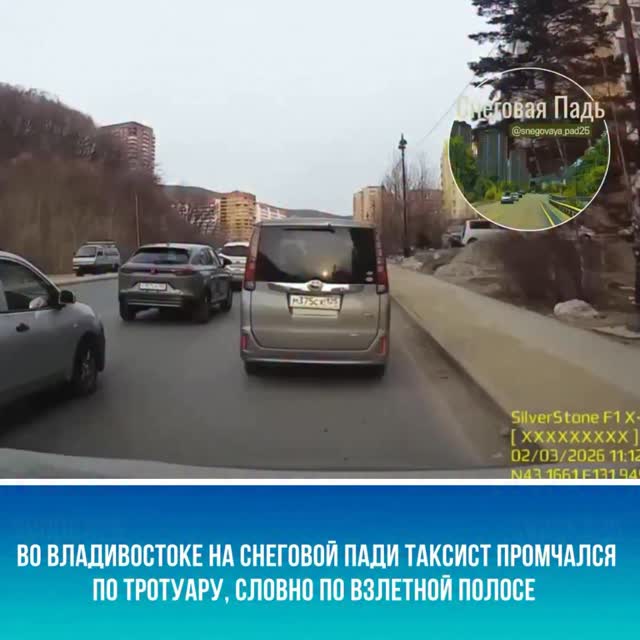 svodka25 🚕Во Владивостоке на Снеговой пади таксист промчался по тротуару, словно по взлетной полосе На Снеговой пади камера видеорегистратора запечатлела, как таксист пролетел мимо стоящего потока по тротуару. Видимо, у таксиста был повышенный коэффициент, не иначе.