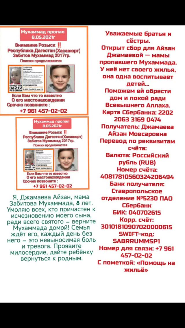 za_muhammada_zabitova Уважаемые братья и сёстры, мы открыли благотворительный сбор для нашей сестры Айзан Джамаевой, у которой пропал сын — Забитов Мухаммад. Уже много лет нет ни одной вести о её ребёнке… У Айзан совсем нет собственного жилья, она живёт в съёмном доме. Помимо пропавшего сына Мухаммада, она одна воспитывает ещё троих детей. За все эти годы здоровье Айзан сильно пошатнулось. Ради Всевышнего Аллаха, давайте объединимся и поможем ей обрести дом и покой, которые ей так необходимы. Любая ваша поддержка — большая милость и свет в её тяжёлой судьбе. Реквизиты для перевода: Карта Сбербанка: 2202 2063 3169 0474 Получатель: Джамаева Айзан Мовсаровна Перевод по реквизитам счёта (для банков и переводов из-за рубежа): Валюта: Российский рубль (RUB) Номер счёта: 40817810560324206494 Банк получателя: Ставропольское отделение №5230 ПАО Сбербанк БИК: 040702615 Корр. счёт: 30101810907020000615 SWIFT-код: SABRRUMMSP1 Номер для перевода:+7 961 457-02-02 Айзан Джамаева. С пометкой: «Помощь на жильё»