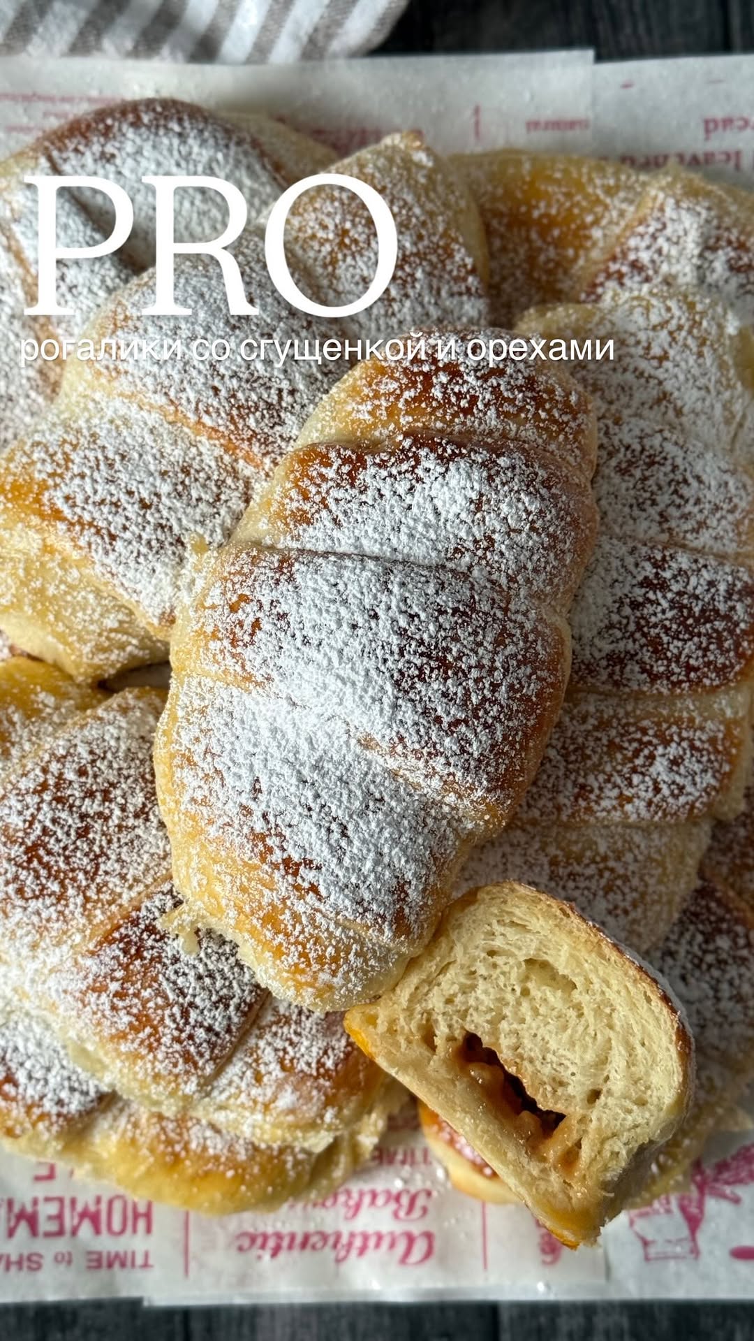 zali_patissier РОГАЛИКИ СО СГУЩЕНКОЙ И ОРЕХАМИ Мир вам и вашему дому 🤍 у меня сегодня для вас рецепт вкусных и невероятных булочек в виде рогаликов как пух 👌 обязательно сохраните чтобы приготовить и не забывайте про ❤️ и комментарии 😁 Ингредиенты для опары: 600 грамм тёплого молока 1 столовая ложка сахара 1 столовая ложка муки 14 грамм сухих дрожжей Ингредиенты для теста: Подошедшая опара 2 яйца 100 грамм сахара Щепотка соли Ванильный сахар 100 грамм мягкого сливочного масла комнатной температуры 1 килограмм муки (150 грамм плюс-минус) Для начала в миске смешиваем тёплое молоко, сахар, муку и сухие дрожжи. Всё хорошо перемешиваем и оставляем на 15–20 минут в тёплом месте, чтобы опара подошла. В подошедшую опару добавляем яйца, сахар, соль, ванильный сахар и мягкое сливочное масло. В конце подсыпаем муку постепенно и замешиваем мягкое, слегка липкое тесто. Готовое тесто смазываем растительным маслом. Ёмкость, в которой будет подходить тесто, также смазываем растительным маслом. Тесто накрываем пищевой плёнкой в контакт, затем накрываем ёмкость пищевой плёнкой и полотенцем. Убираем в тёплое место на полтора часа. Подошедшее тесто обминаем, делим на две равные части и раскатываем. Смазываем тесто растительным маслом, муку для подпыливания не используем, чтобы булочки получились воздушными. Раскатываем тесто в пласт и делим на равные части в форме треугольников. Из одного пласта получается 12 треугольников. Каждый треугольник немного разминаем руками, делаем его шире. На каждый треугольник выкладываем начинку из грецких орехов и варёного сгущённого молока. Сворачиваем рогалики и выкладываем их на противень. Противень накрываем полотенцем или пищевой плёнкой. Убираем в тёплое место на 20–25 минут, пока булочки подойдут. Подошедшие булочки смазываем желтком или молоком с сахаром. Отправляем в разогретую до 180 градусов духовку и выпекаем до золотистой корочки. Готовые булочки посыпаем сахарной пудрой и подаём к столу. Получаются очень воздушные и мягкие булочки, как пух.